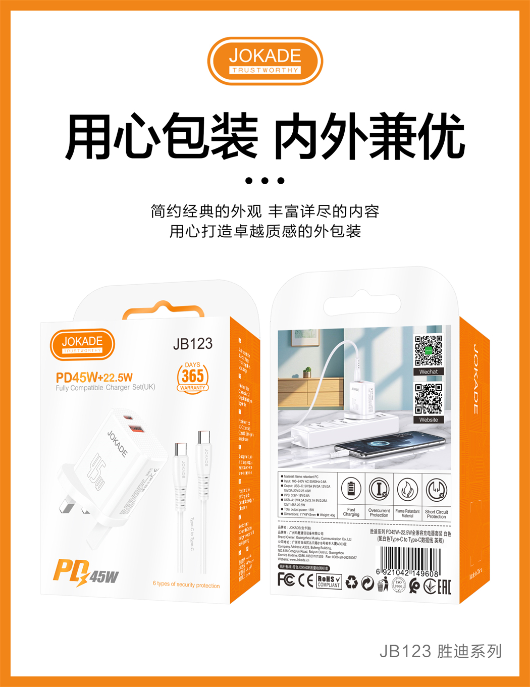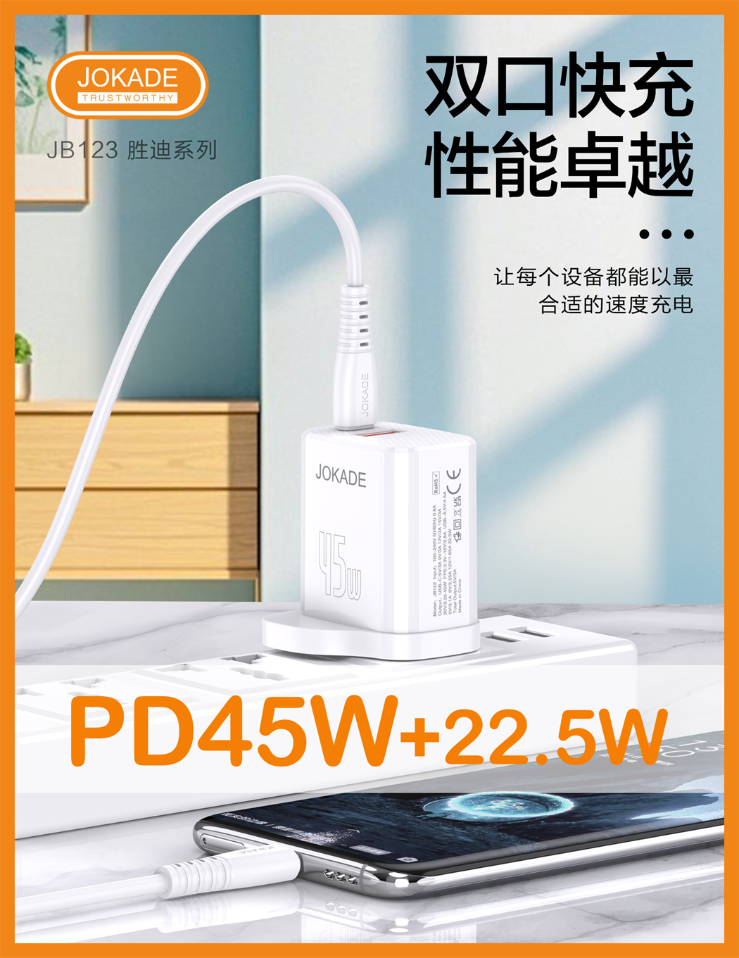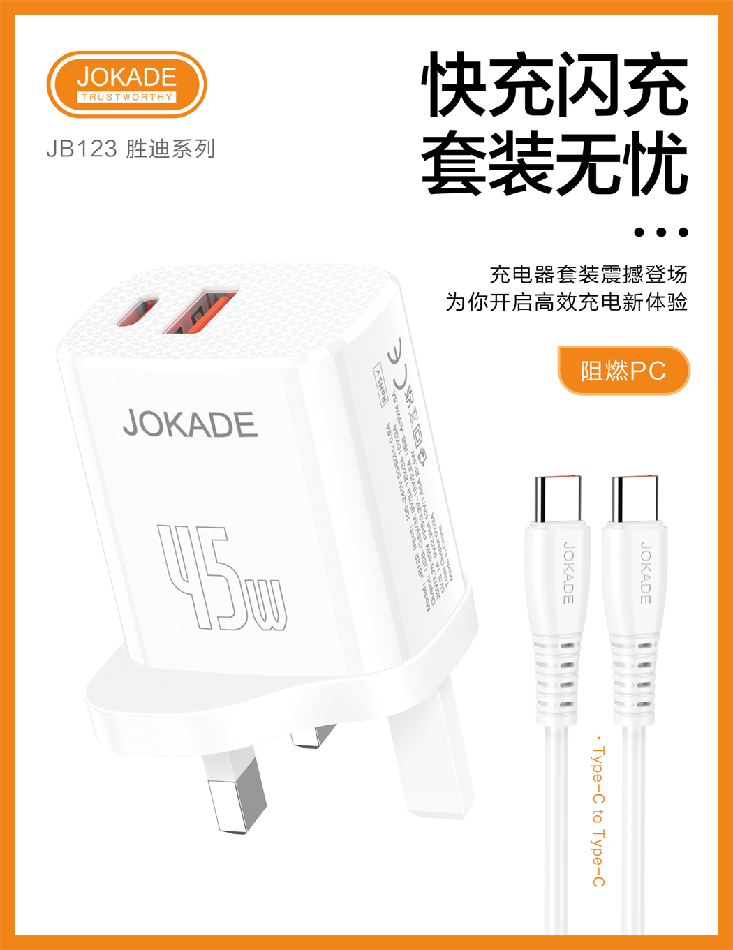 产品名称:JB123 胜迪系列 PD45W+22.5W全兼容充电器套装 Type-C to Type-C(英规)