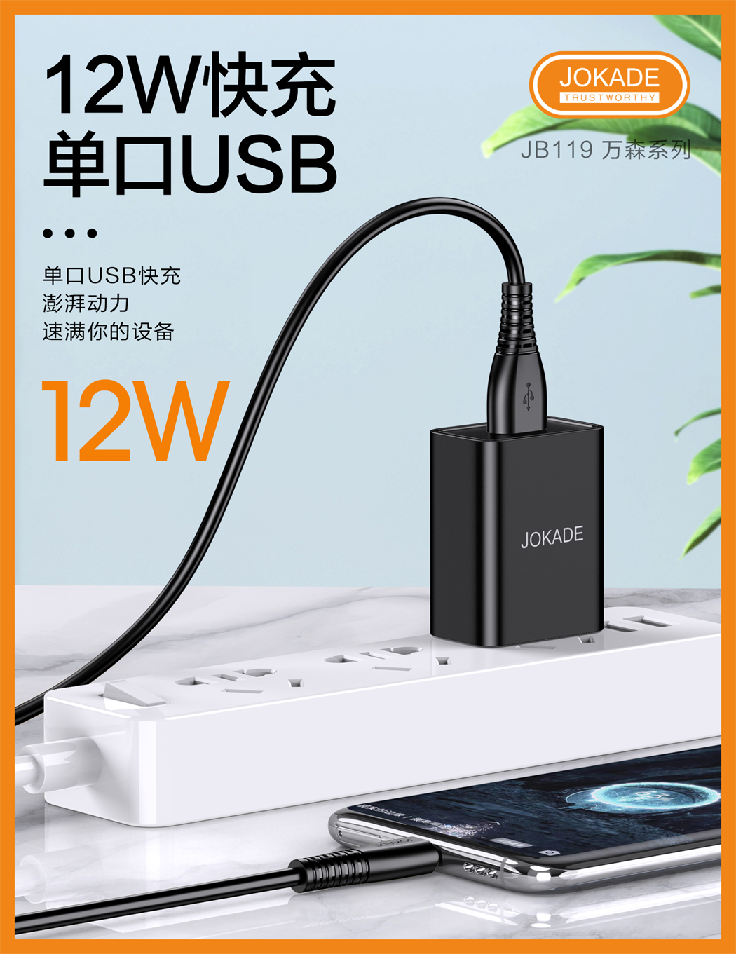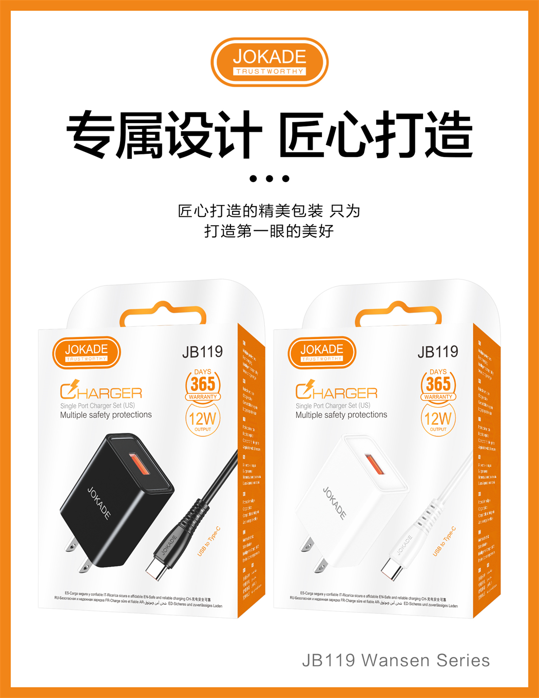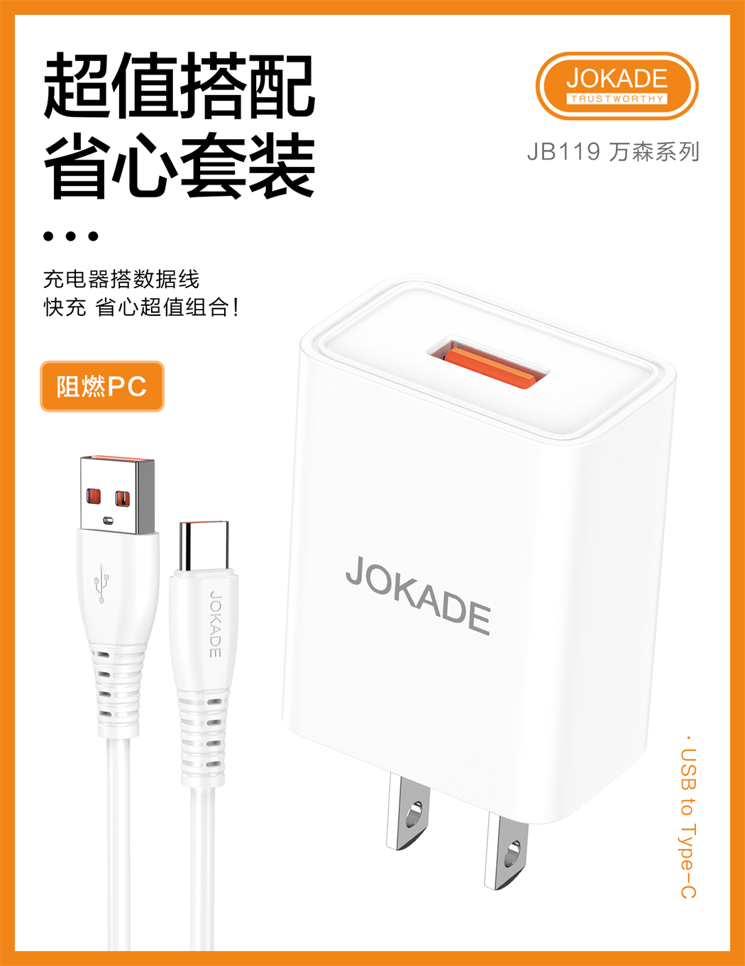 产品名称:JB119 万森系列 单口充电器套装USB to Type-C(美规)