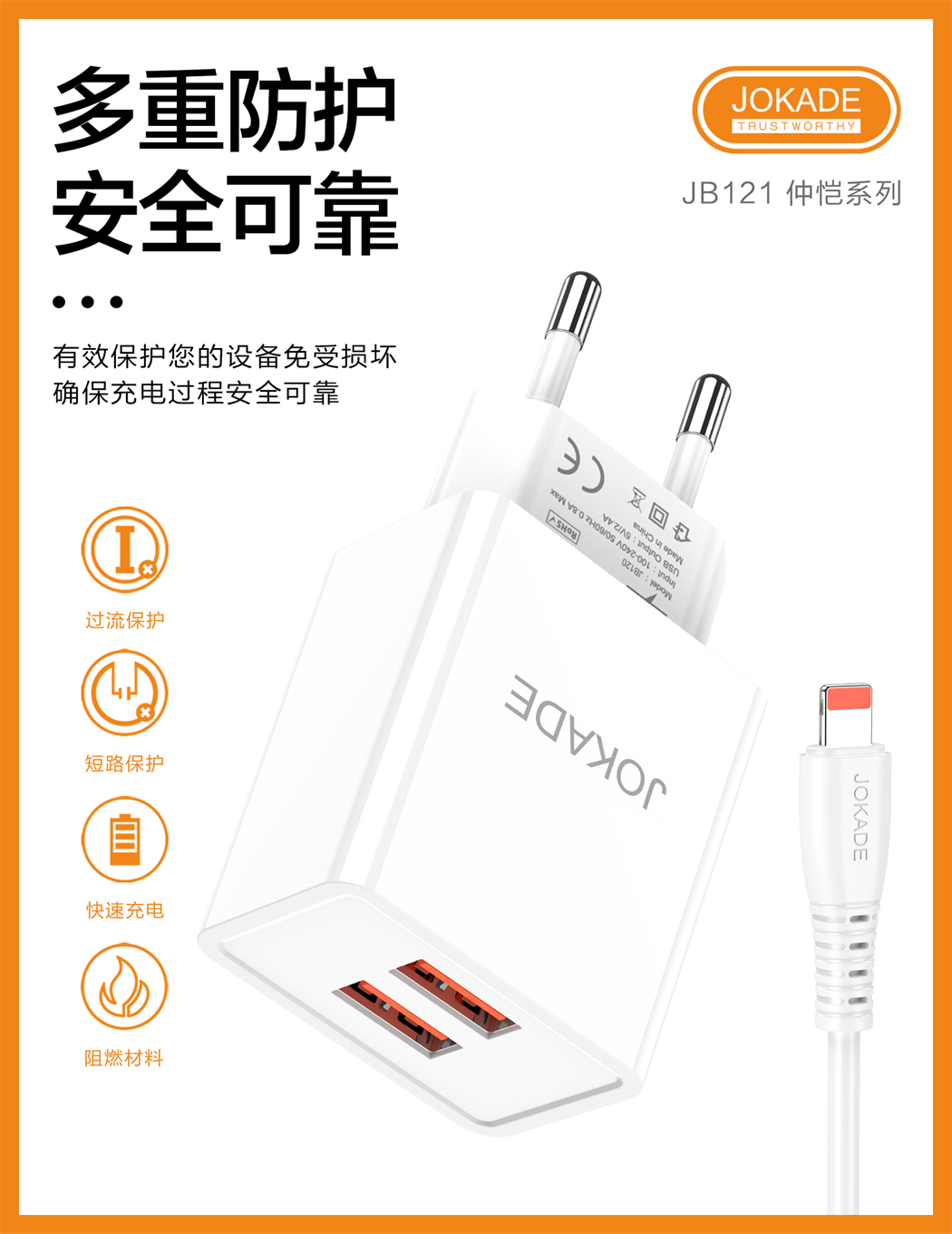 产品名称:JB121 仲恺系列 双口充电器套装 USB to Lightning(EU)
