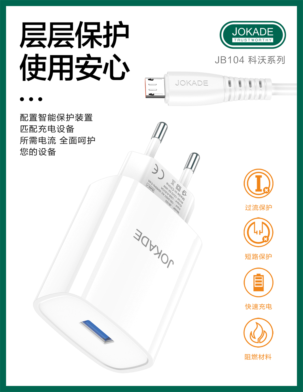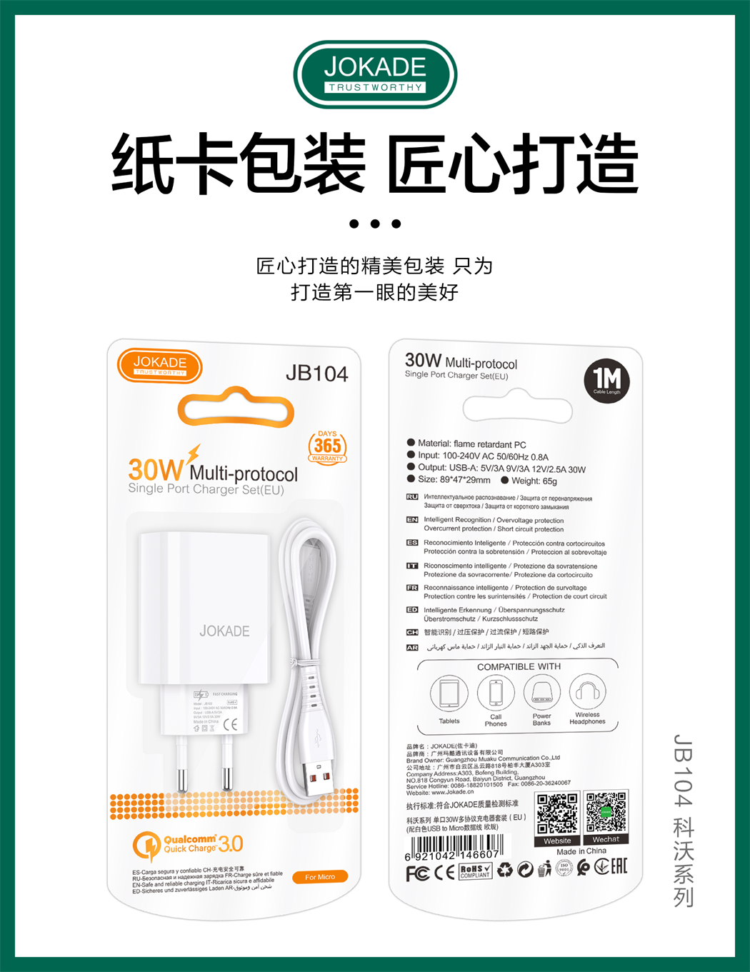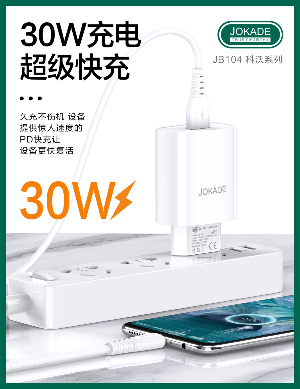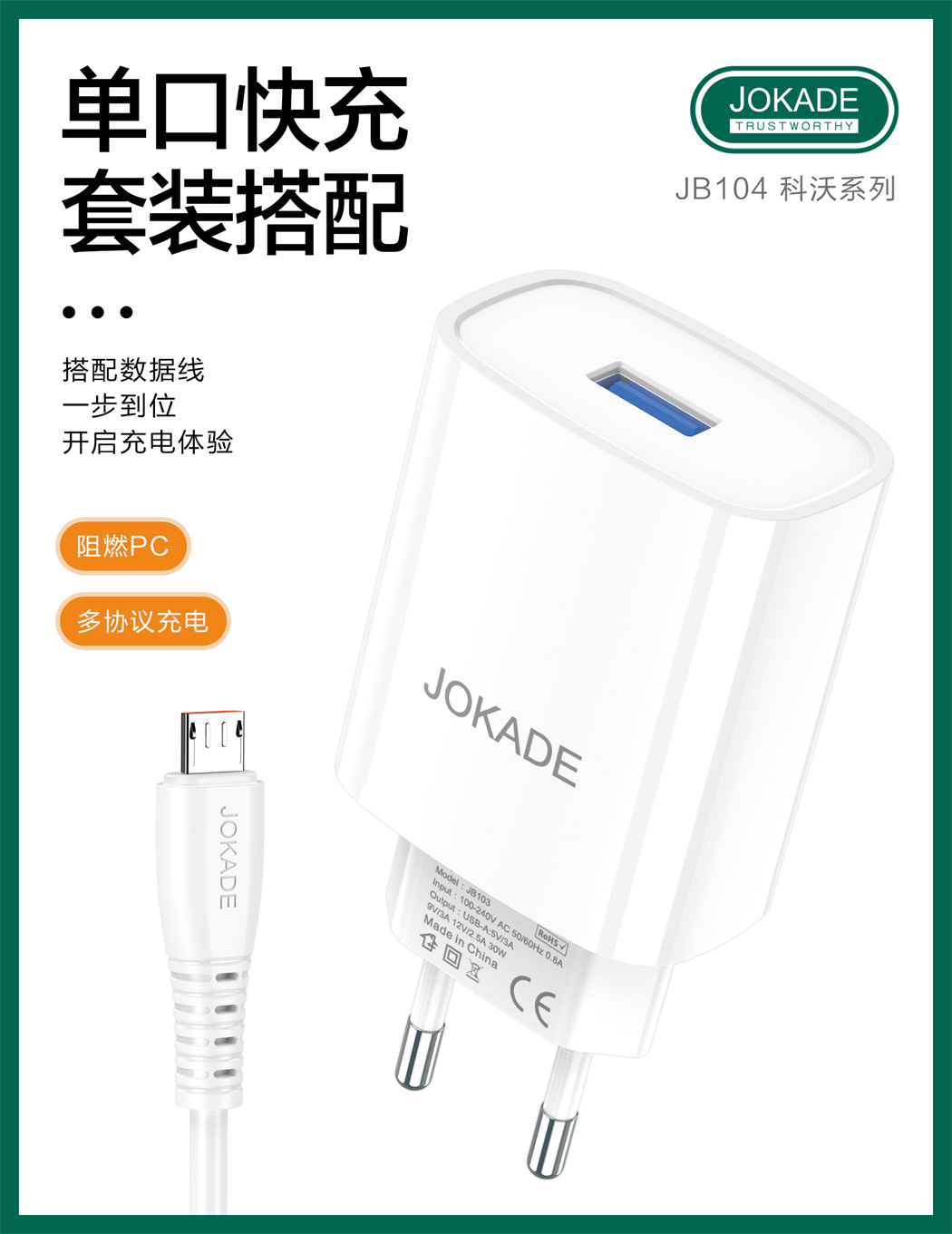 产品名称:JB104 科沃系列 单口 30W多协议充电器套装(EU)USB to Micro
