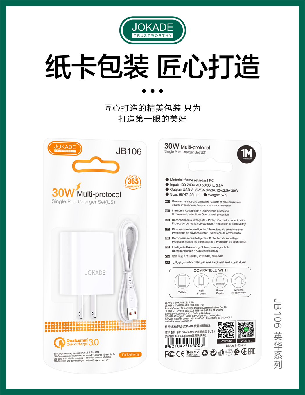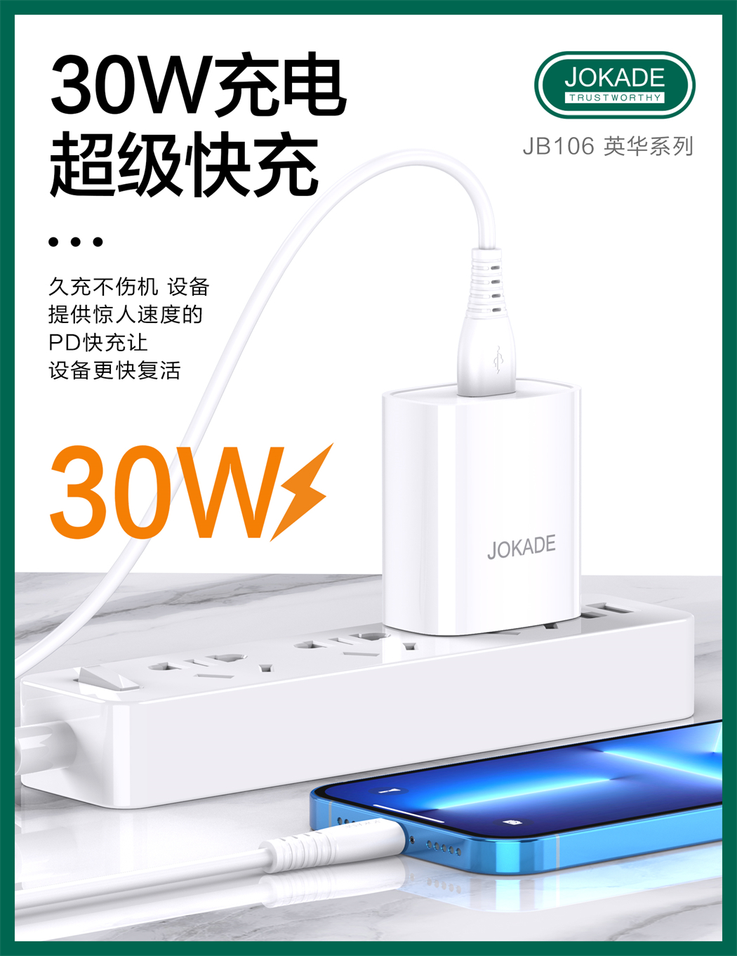 产品名称:JB106 英华系列 单口 30W多协议充电器套装(US)USB to Lightning