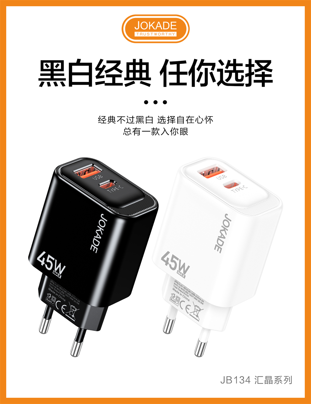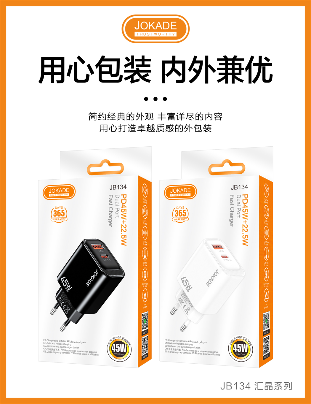 产品名称:JB134 汇晶系列 PD45W+22.5W全兼容充电器(欧规)
