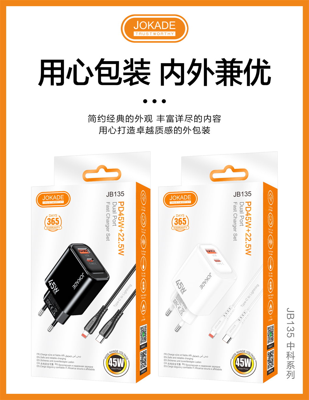 产品名称:JB135 中科系列 PD45W+22.5W全兼容充电器套装Type-C to Lightning(欧规)