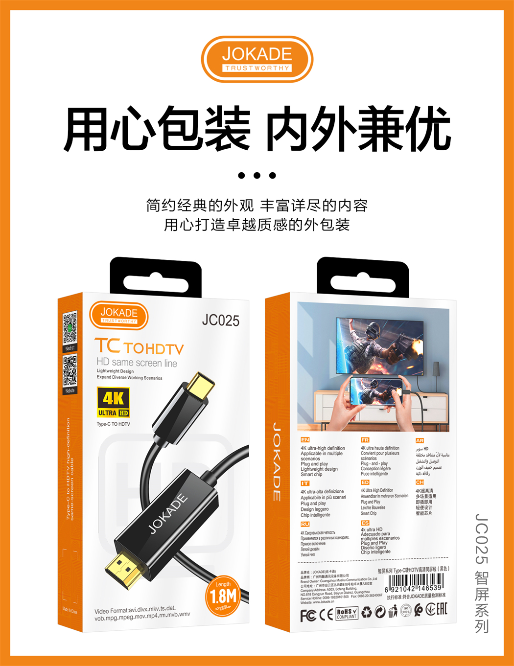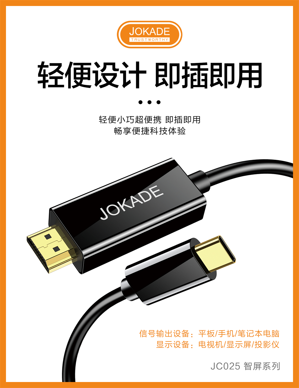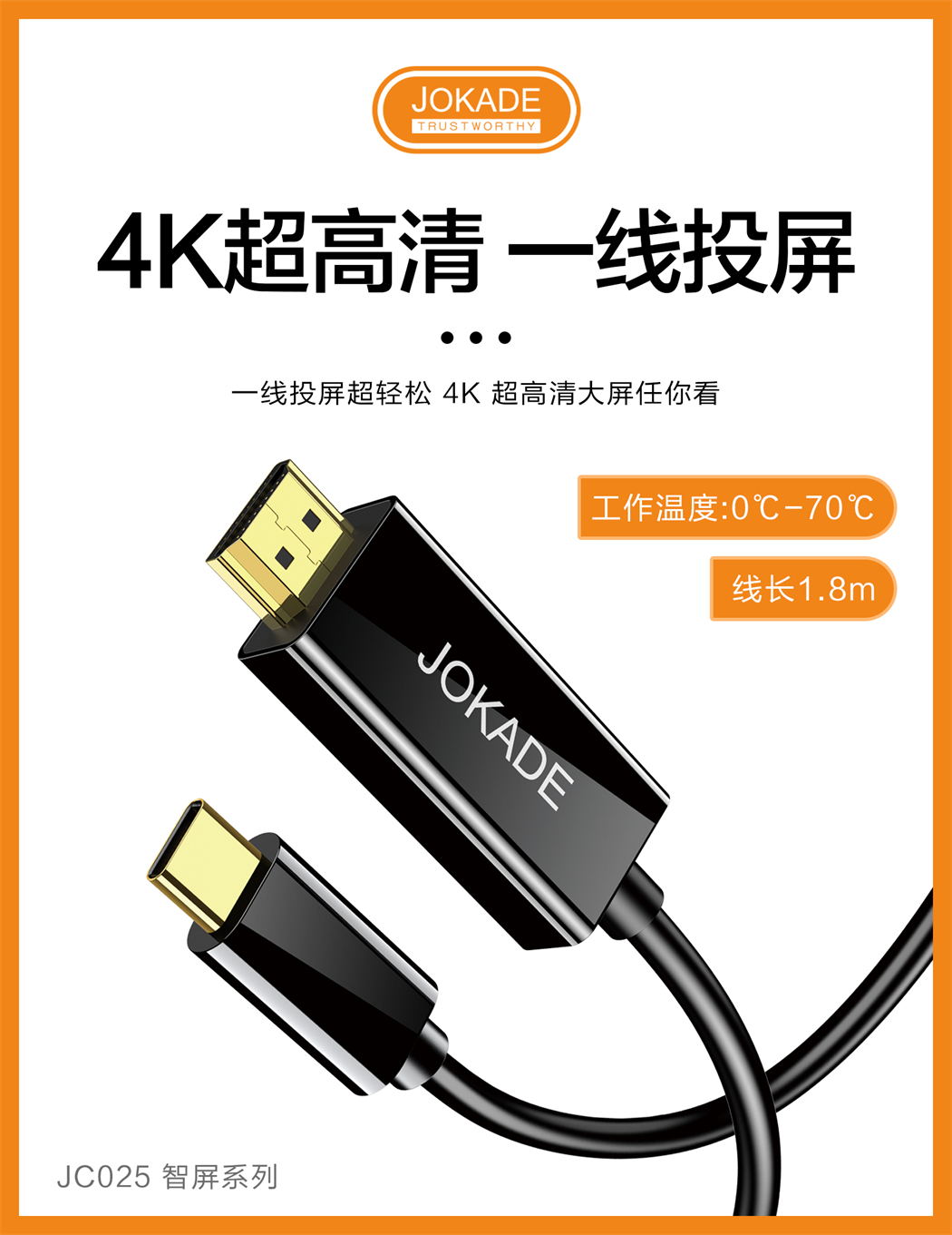 产品名称:JC025 智屏系列 Type-C转HDTV高清同屏线