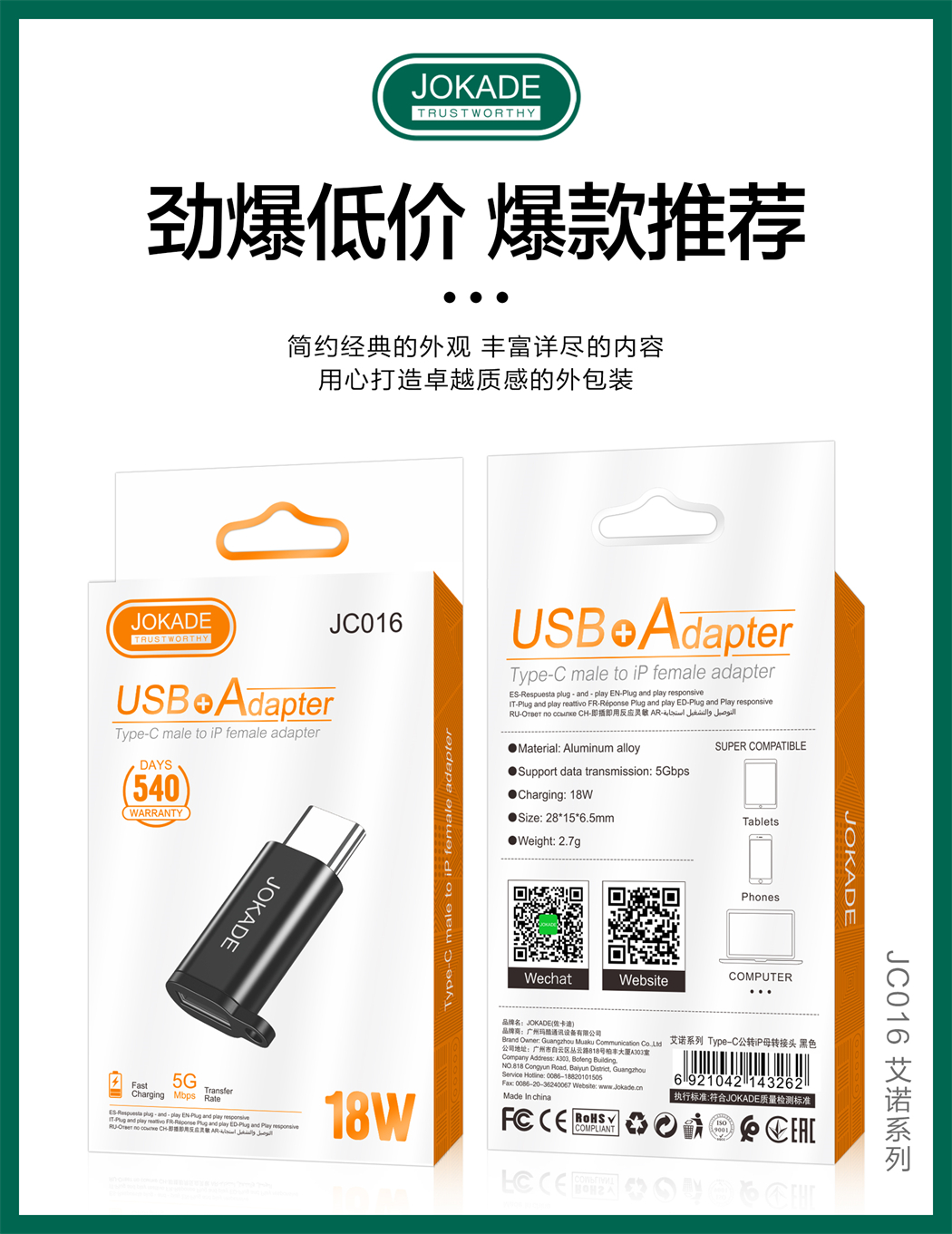 > JC016 艾诺系列 Type-C公转iP母转接头