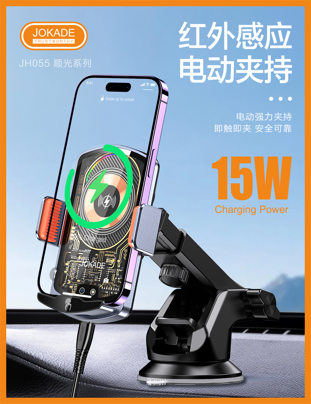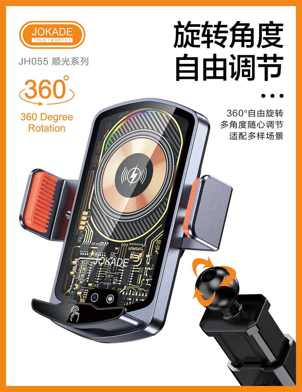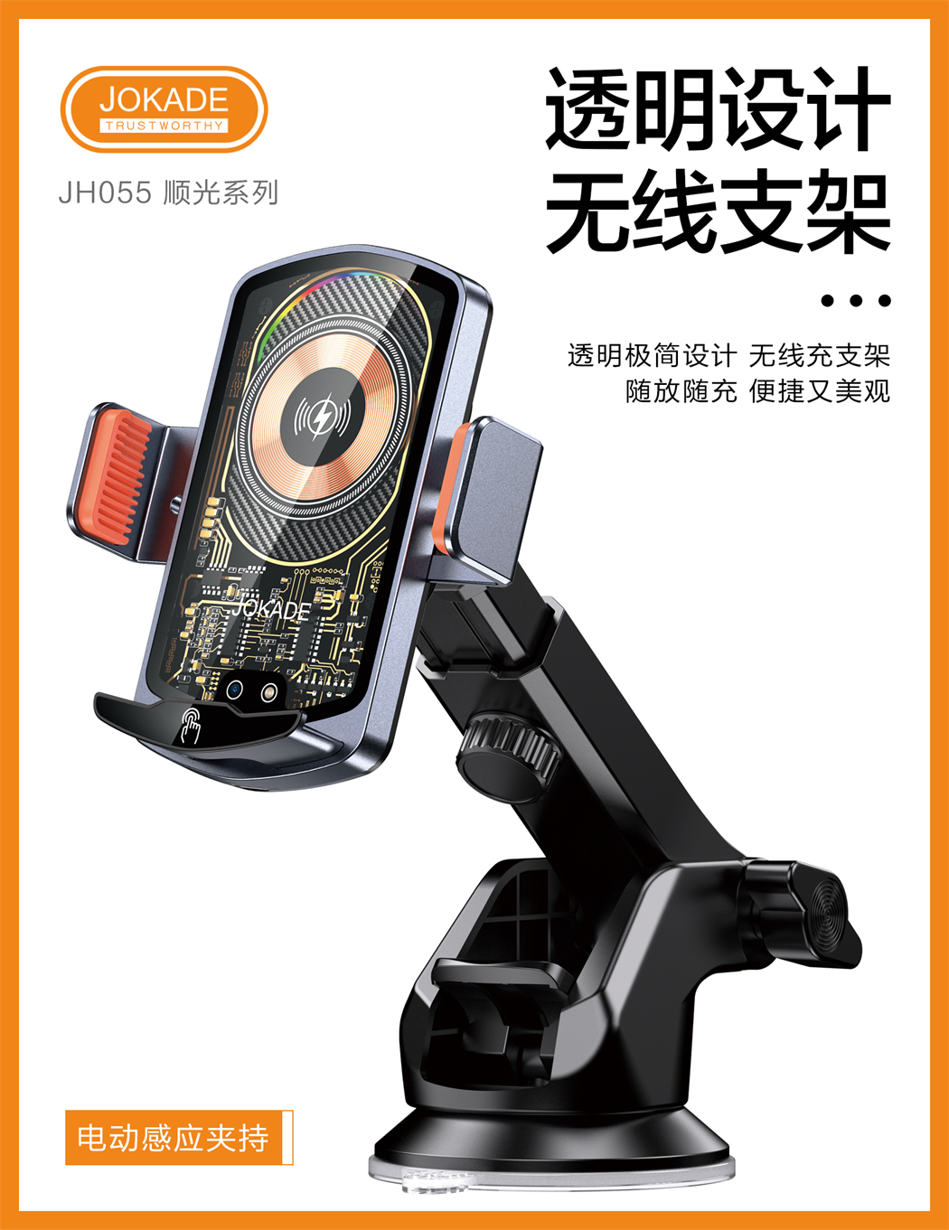 产品名称:JH055 顺光系列 红外感应车载无线充支架(吸盘伸缩式)