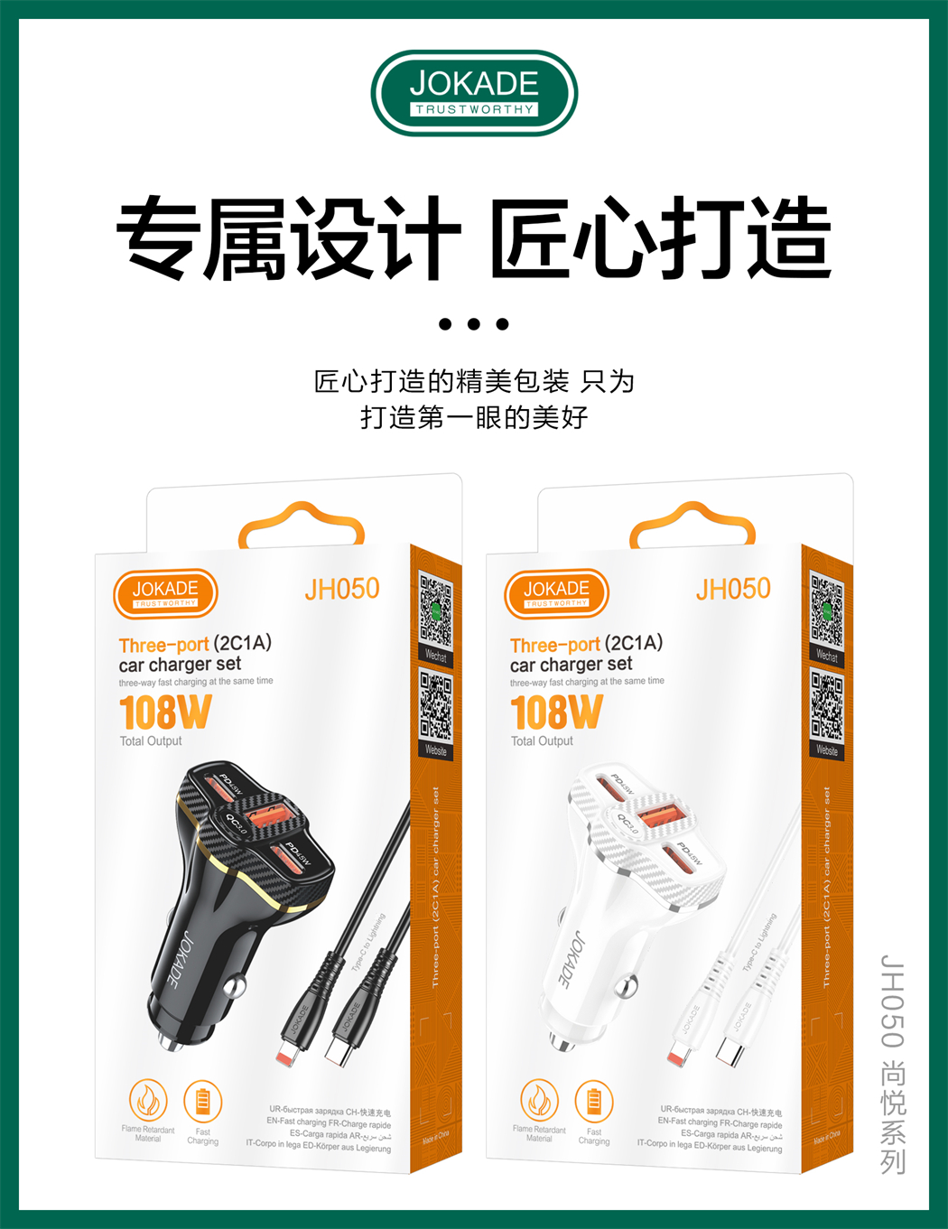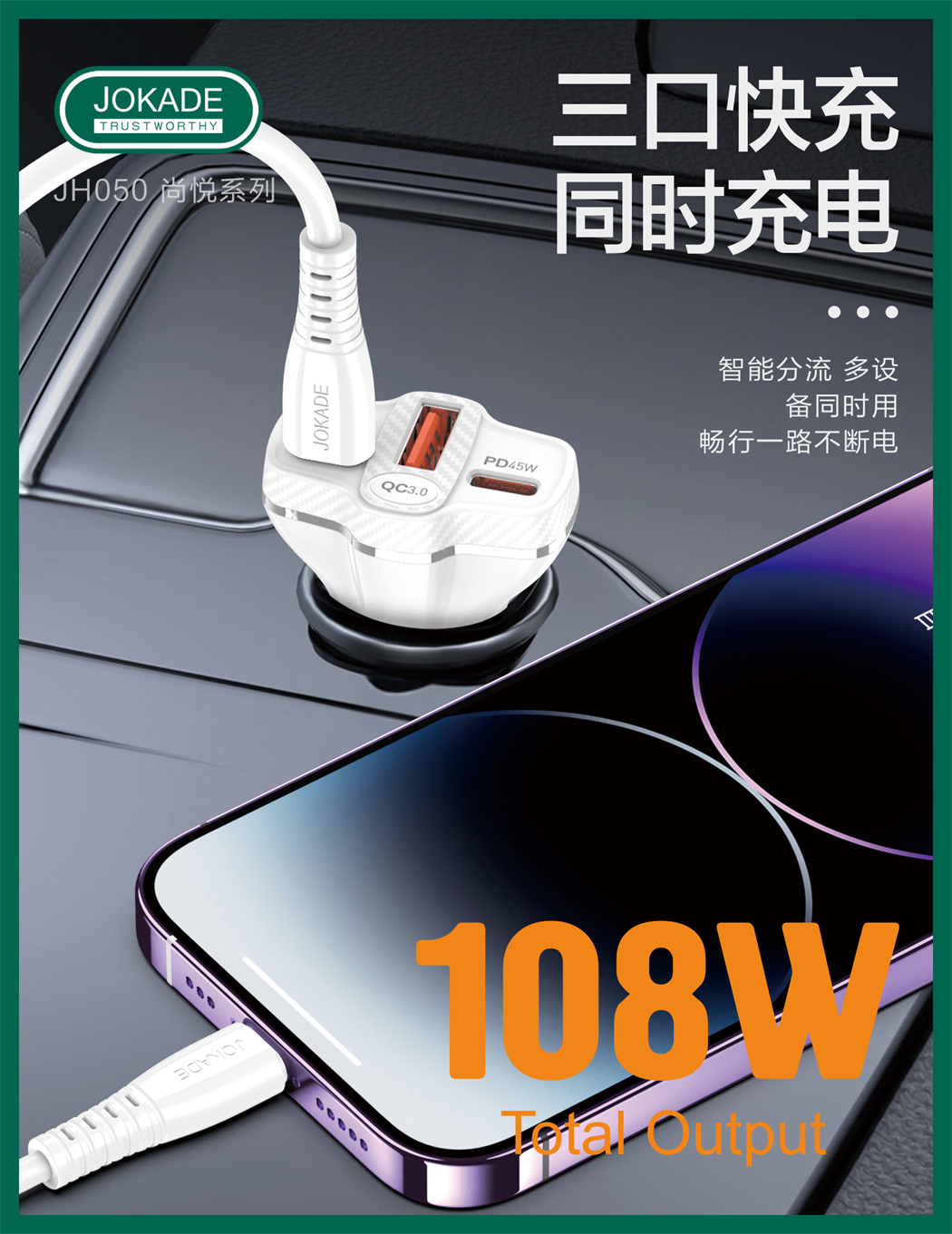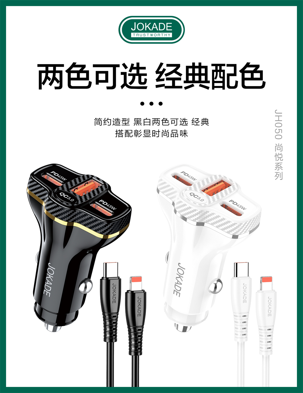 产品名称:JH050 尚悦系列 三口(2C1A)车载充电器套装(Type-C to Lightning)